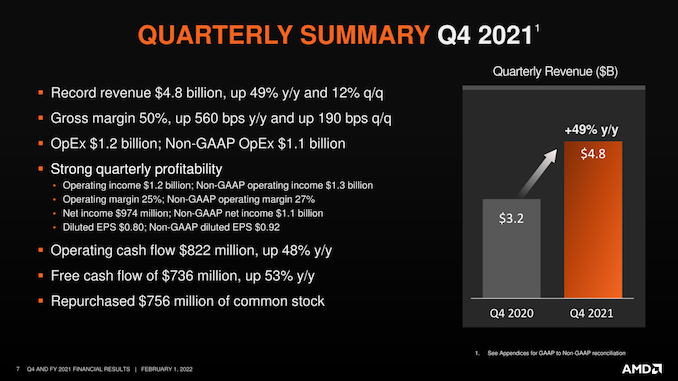 For the fourth quarter of 2021, AMD reported $4.8B in revenue, a 49% jump over the same quarter a year ago. As a result, Q4’2021 was (yet again) AMD’s best quarter ever, built on the back of strong sales across the entire company. Meanwhile, due to last year’s unusual, one-off gain related to an income tax valuation allowance, AMD’s GAAP net income did dip on a year-over-year basis, to $974M. In lieu of that, AMD’s quarterly non-GAAP net income (which excludes the tax allowance) was up 77% year-over-year, which is an even bigger jump than what we saw in Q4’20.