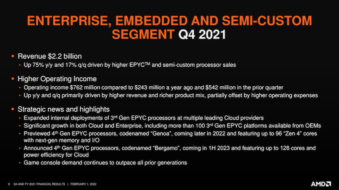 As is usually the case, AMD doesn’t break apart EPYC and semi-custom sales figures, but the company is noting that data center, server, and cloud revenue – essentially everything EPYC except HPC – all more than doubled versus the year-ago quarter. All of which propelled AMD to doubling EPYC sales versus Q4’20, setting new records in the process. AMD has also noted that they’ve shipped their first V-cache enabled EPYC CPUs (Milan-X) to Microsoft, who is using them in an upcoming Azure instance type.