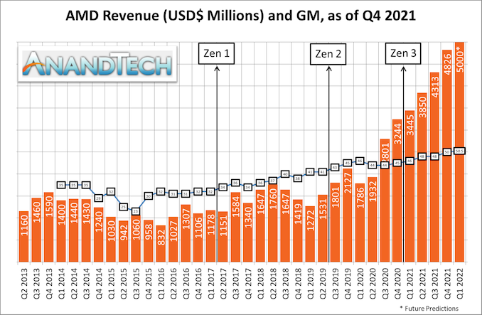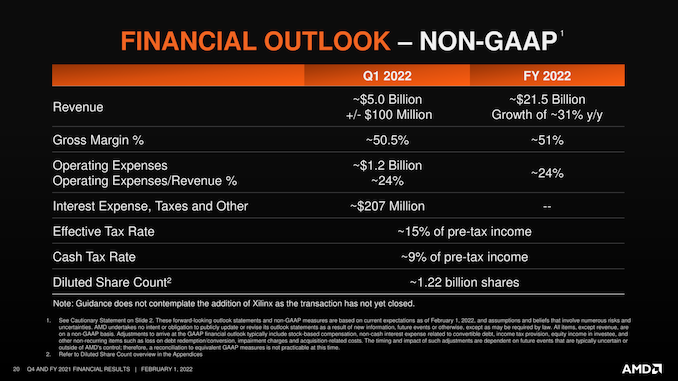 To that end, AMD is officially projecting revenue growth of 31% for 2022, which would bring AMD to around $21.5B in sales. Given AMD’s 2021 estimate, this is likely once again conservative, though it is noteworthy in that it’s a bit less growth than AMD was projecting at this point a year ago for 2021. More interestingly, perhaps, is that AMD expects the non-GAAP gross margin for the year to land at around 51%, which even if it’s also a conservative estimate, would still be a big accomplishment for AMD.