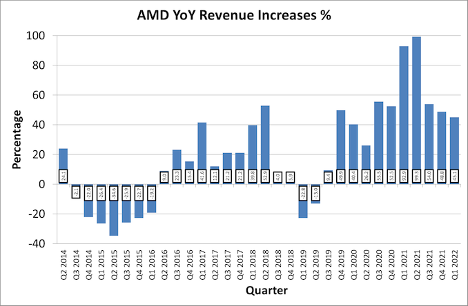 Driving this growth will be a new slate of products for many of AMD’s important product lines. Along with ramping deliveries of Milan-X EPYC processors, AMD is also slated to deliver their Genoa EPYC processors, based on AMD’s Zen 4 CPU architecture, later this year. Zen 4 will also be making its appearance in Ryzen processors in H2’22, and in the meantime AMD has just launched their Zen3+ based Ryzen 6000 APUs for laptops. Finally, GPUs based on AMD’s forthcoming RDNA 3 architecture remain on the roadmap to be launched later this year as well.