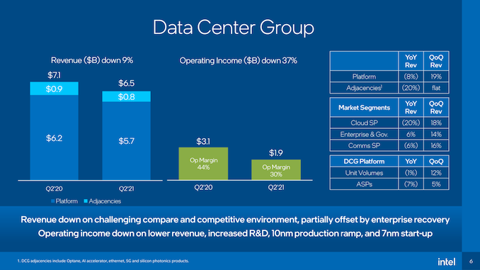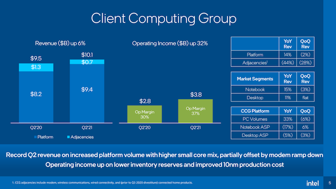 For Q2, Intel’s Client Computing Group was once again the biggest winner; that division pulled in $10.1B in revenue, and is up 6% YoY. According to Intel, both laptop and desktop revenue is up, as Intel has surpassed shipping 50 million Tiger Lake processors. That said, these revenue gains are largely volume-driven; ASPs for both desktop and mobile are down, due in part to what Intel is noting to be increased sales of low core count processors. Intel’s improving fab situation has also played a part here – according to the company, 10nm production costs have dropped, helping to improve the division’s operating income.
