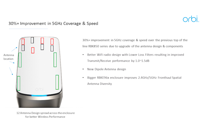 The RBKE960 supports 16 Wi-Fi streams, making for an extremely complex antenna design. Netgear has made improvements based on past experience to the extent that the new Orbi RBKE960 performs better than the Orbi RBK850 even for 5GHz communication (the larger size of the unit also plays a part in this).